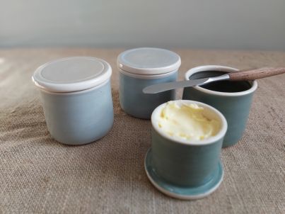 ![]() | French Butter Pots I read about these and decided to have a go at making them. Fill the pot with butter and then put a small amount of water in the keeper and put the lid back on. The water creates a seal against the butter so you can keep the butter out of the fridge and it stays fresh. Tried and tested! £32 |